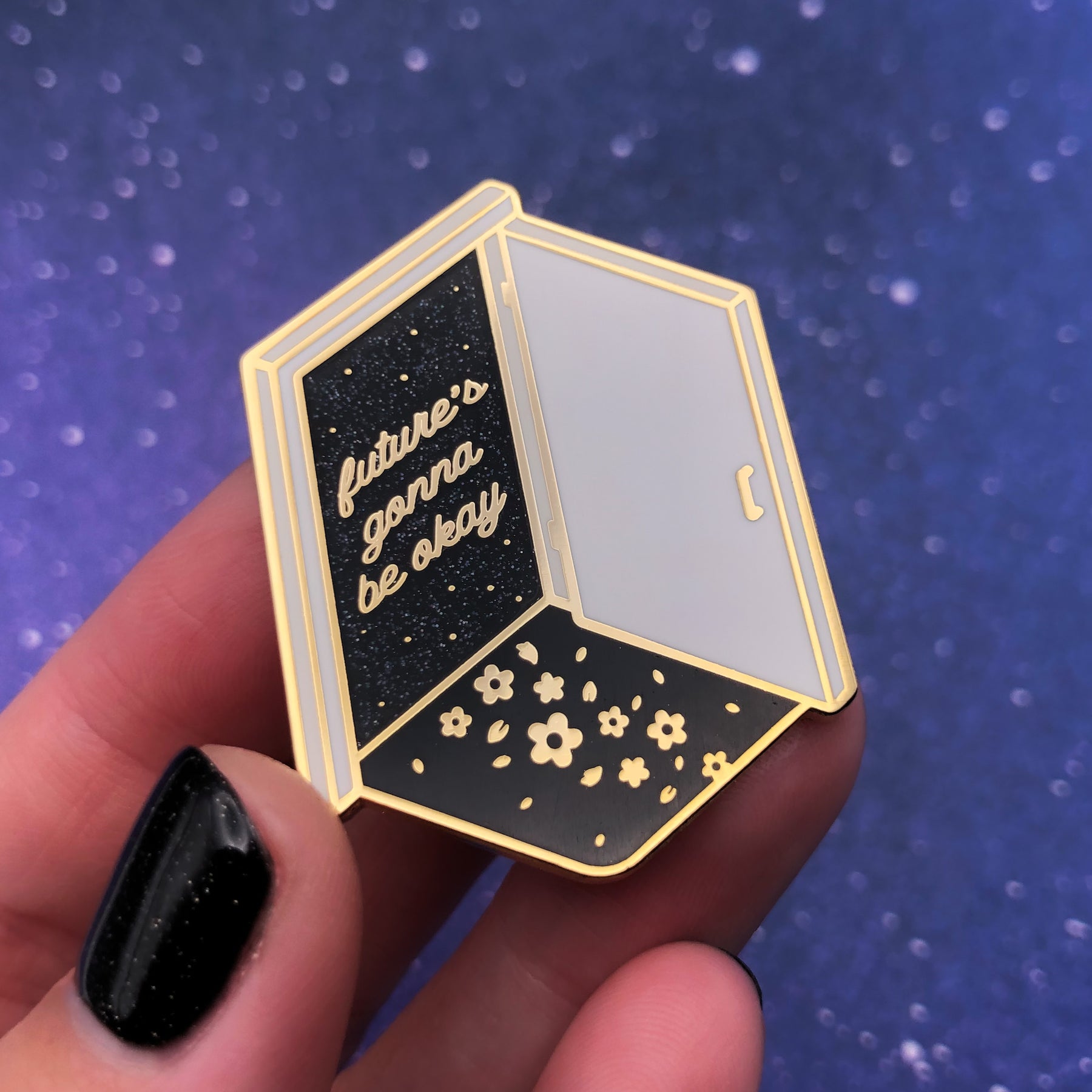 Future's gonna be okay. 🪷 This pin is inspired by the D-DAY Final, when Yoongi walks through the white door at the end of the tour– a callback to the door in the "Amygdala" MV. It features a flower path inspired by the members' references to walking along the flower path with ARMY, as well as the flowers on Yoongi's mic/guitar pick. The path leads to a glittery sky and some comforting and hopeful "D-DAY" lyrics.